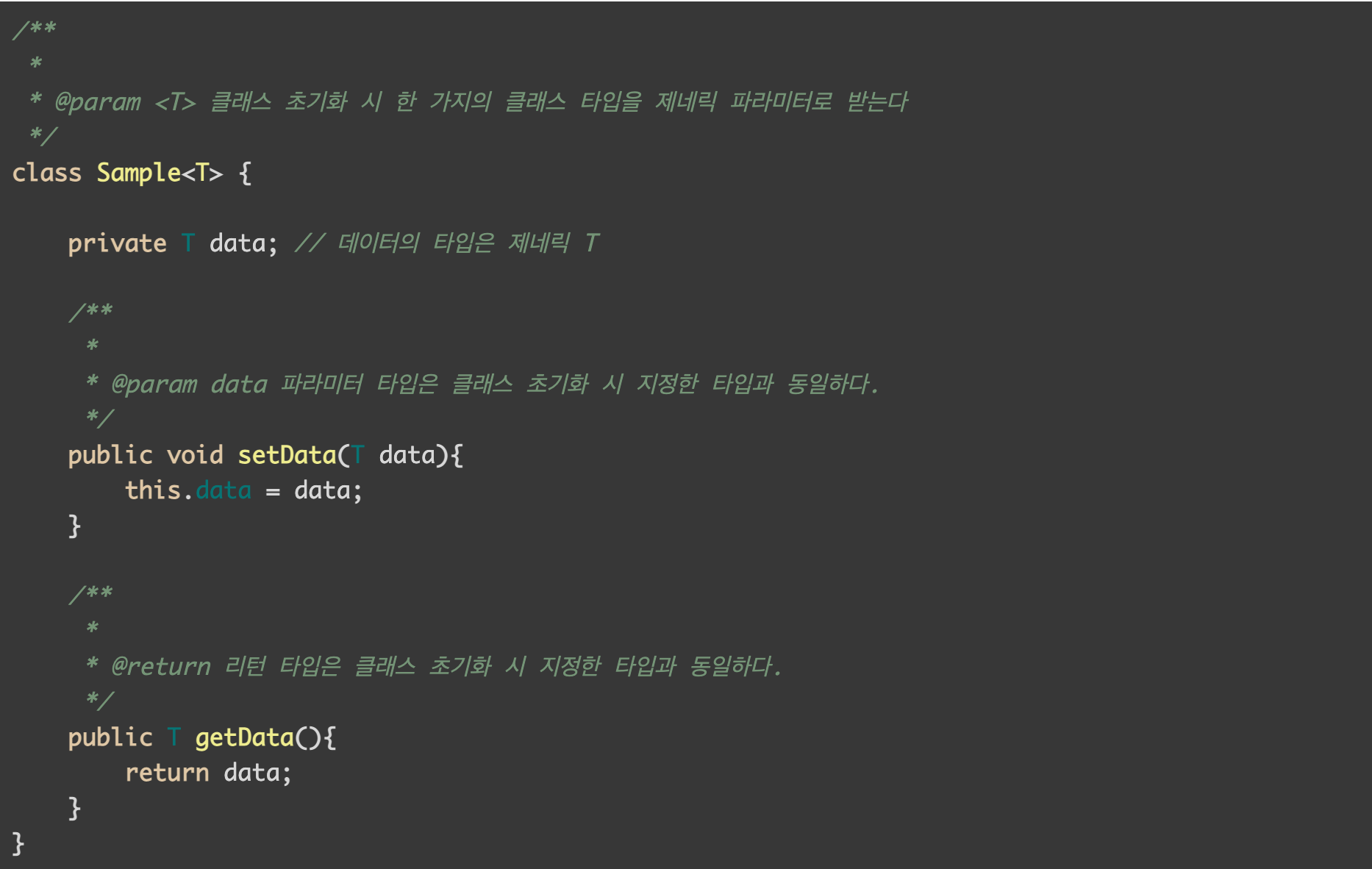Sample클래스를 초기화시키면서 임의의 클래스를 제네릭 파라미터로 전달하여 Sample클래스의 T에 대한 타입을 지정