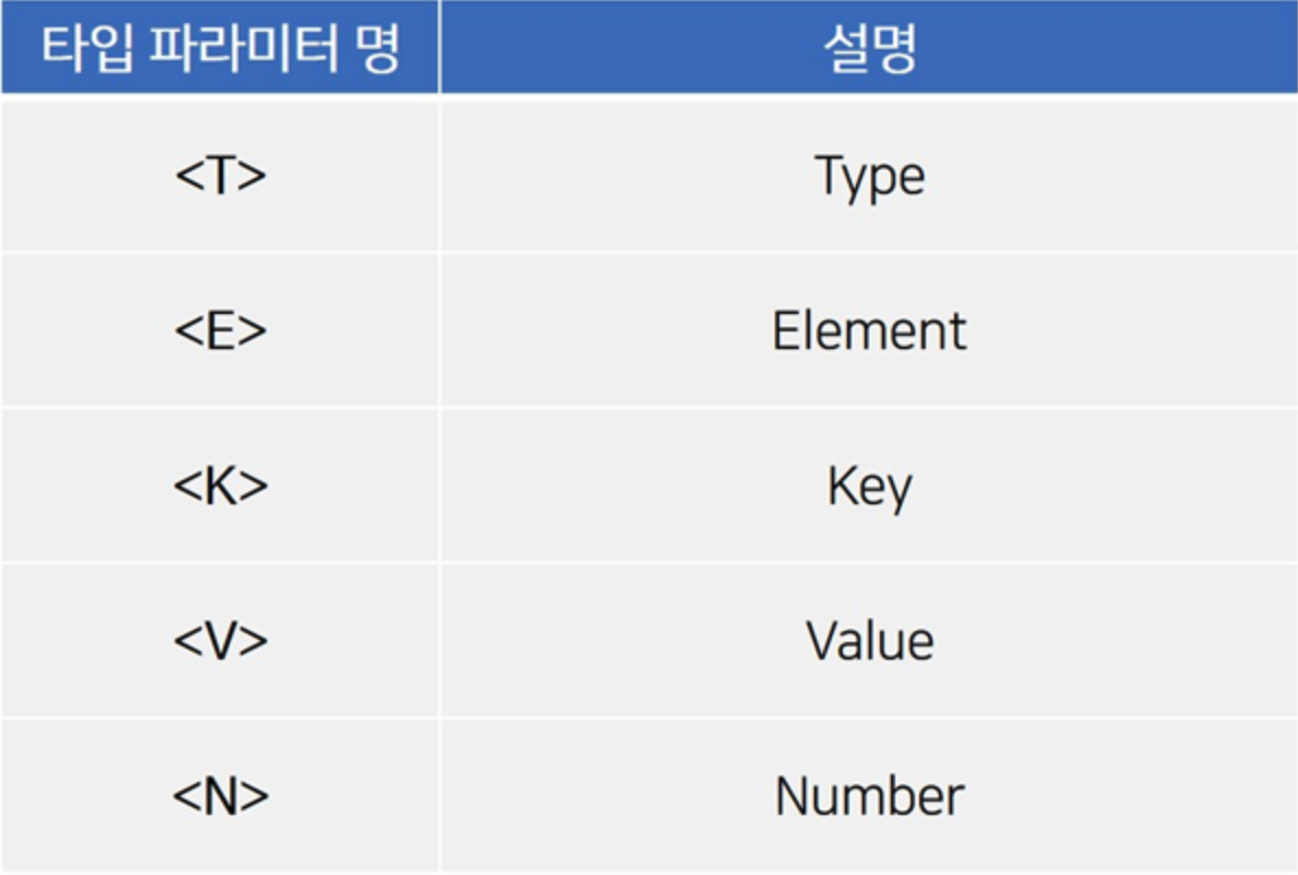 Type Parameter로 사용하는 변수들은 보통 아래와 같이 많이 사용한다.