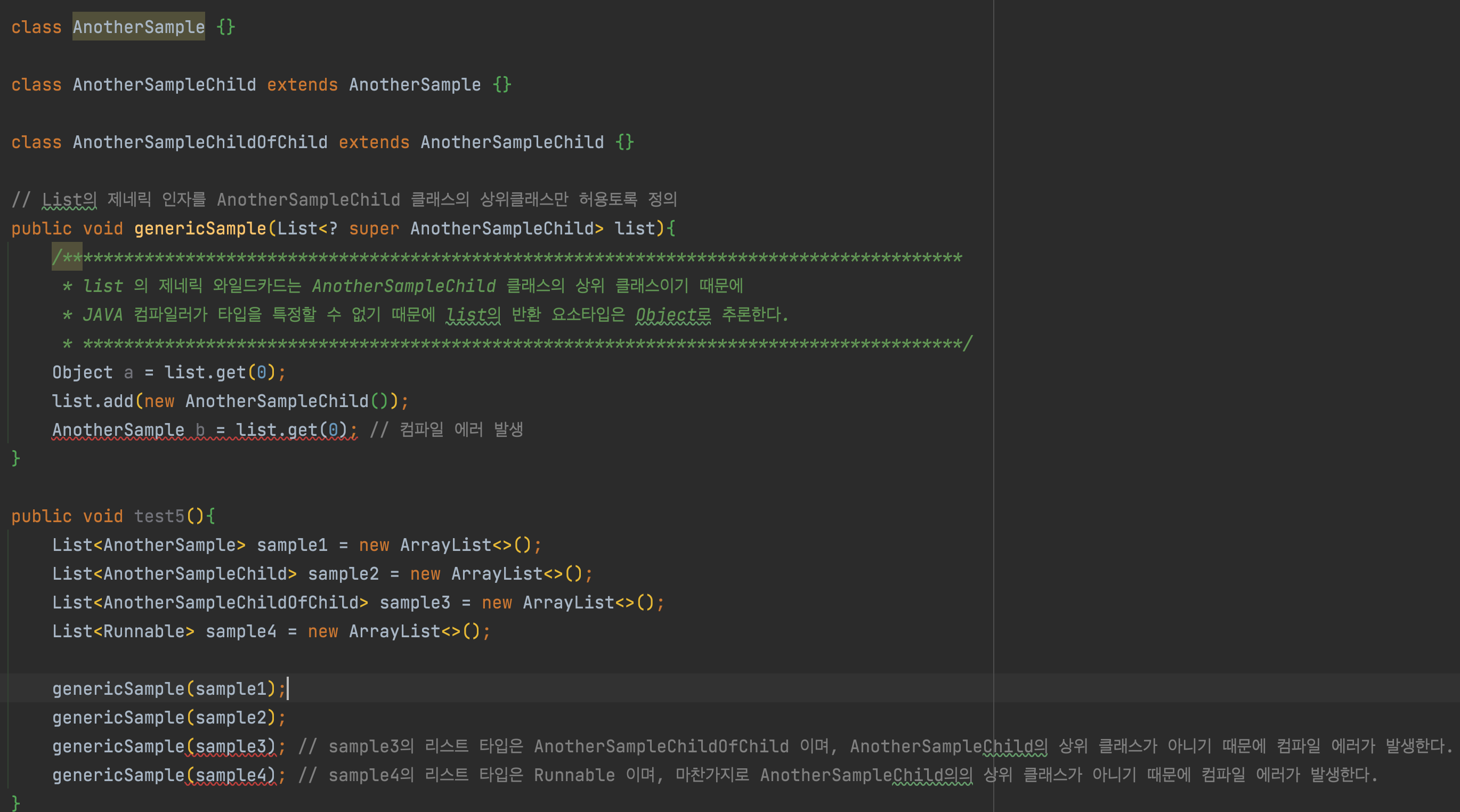 JAVA 컴파일러는 대입연산을 수행할 때 left-value의 제네릭타입과 right-value의 제네릭타입이 정확하게 일치하지 않을 경우 컴파일 에러를 발생시킨다. (불변성)