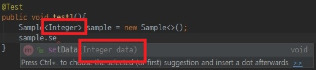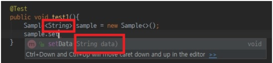 이처럼 제네릭 타입으로 어떤 클래스를 전달했냐에 따라서 메소드의 파라미터, 혹은 리턴타입이 제네릭 파라미터로 전달받은 클래스 타입으로 유연하게 바뀌며 동시에 강제성을 갖게 해주는 부분을 확인할 수 있다.