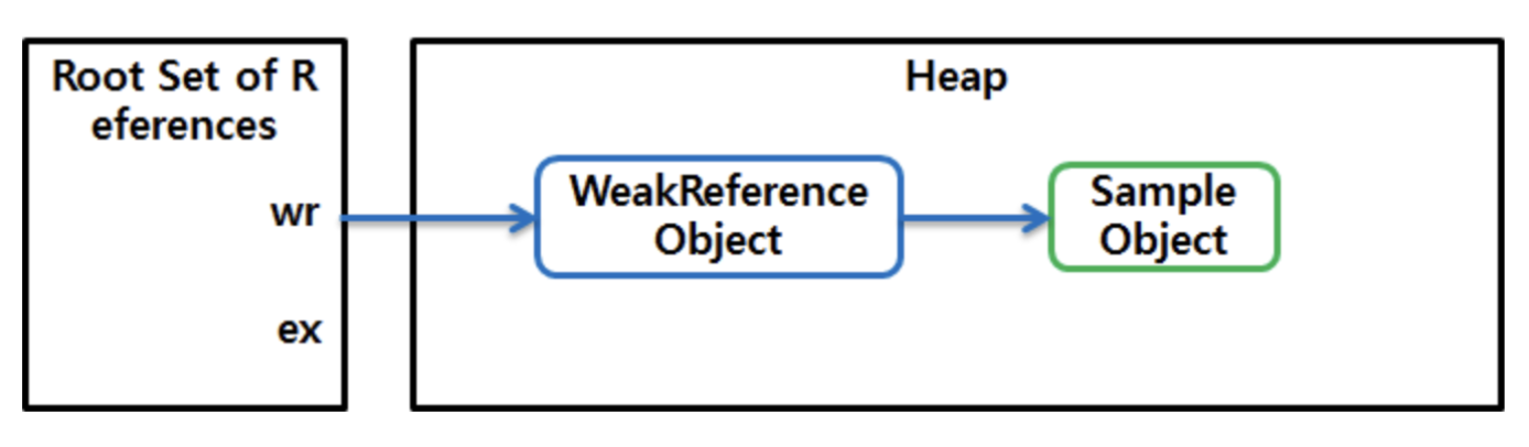 위 코드의 마지막 줄에서 ex참조에 null을 대입하면 처음 생성한 Sample 객체는 오직 WeakReference 내부에서만 참조된다.