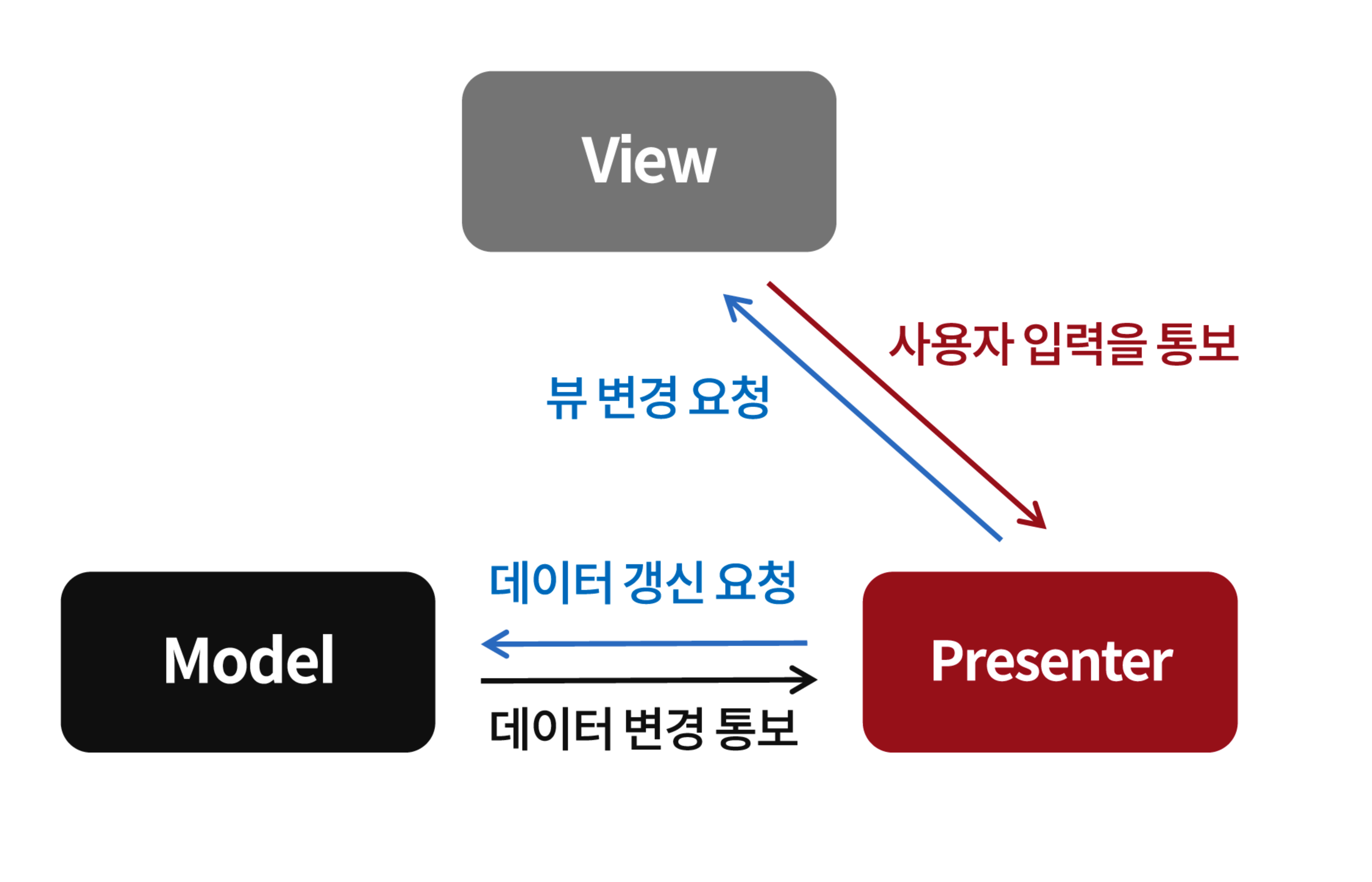 - 뷰는 프리젠터의 요청에 따라서만 수동적으로 화면의 변화를 처리하게 된다.