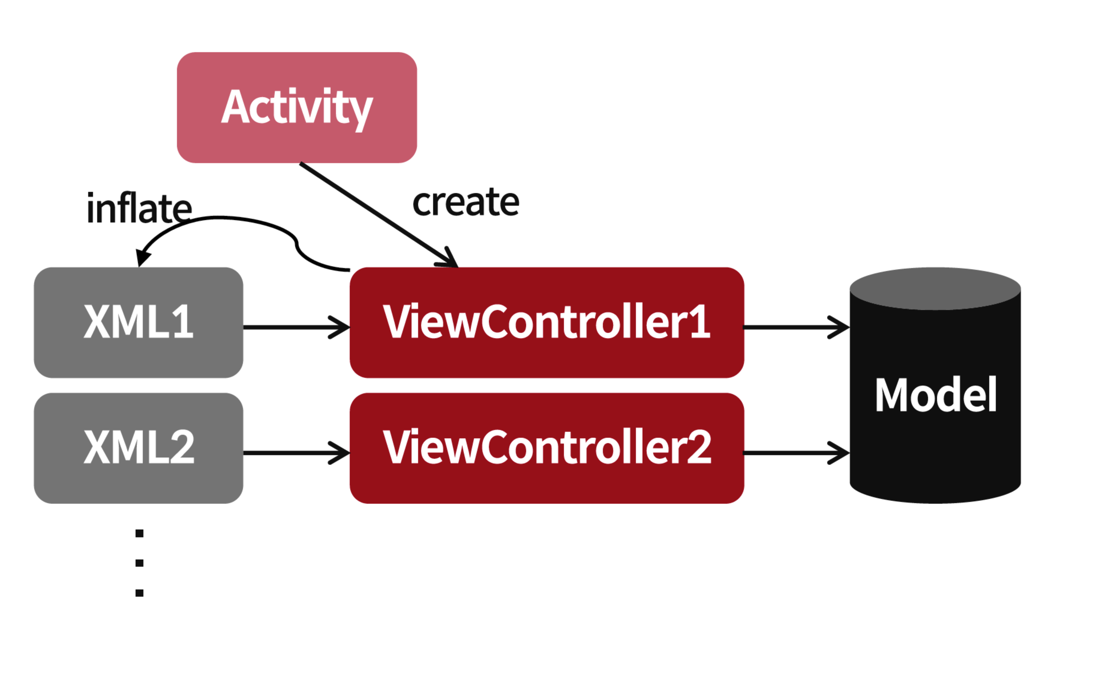 - 그러나 Android 에서는 View 와 Controller 의 분리가 쉽지 않다.