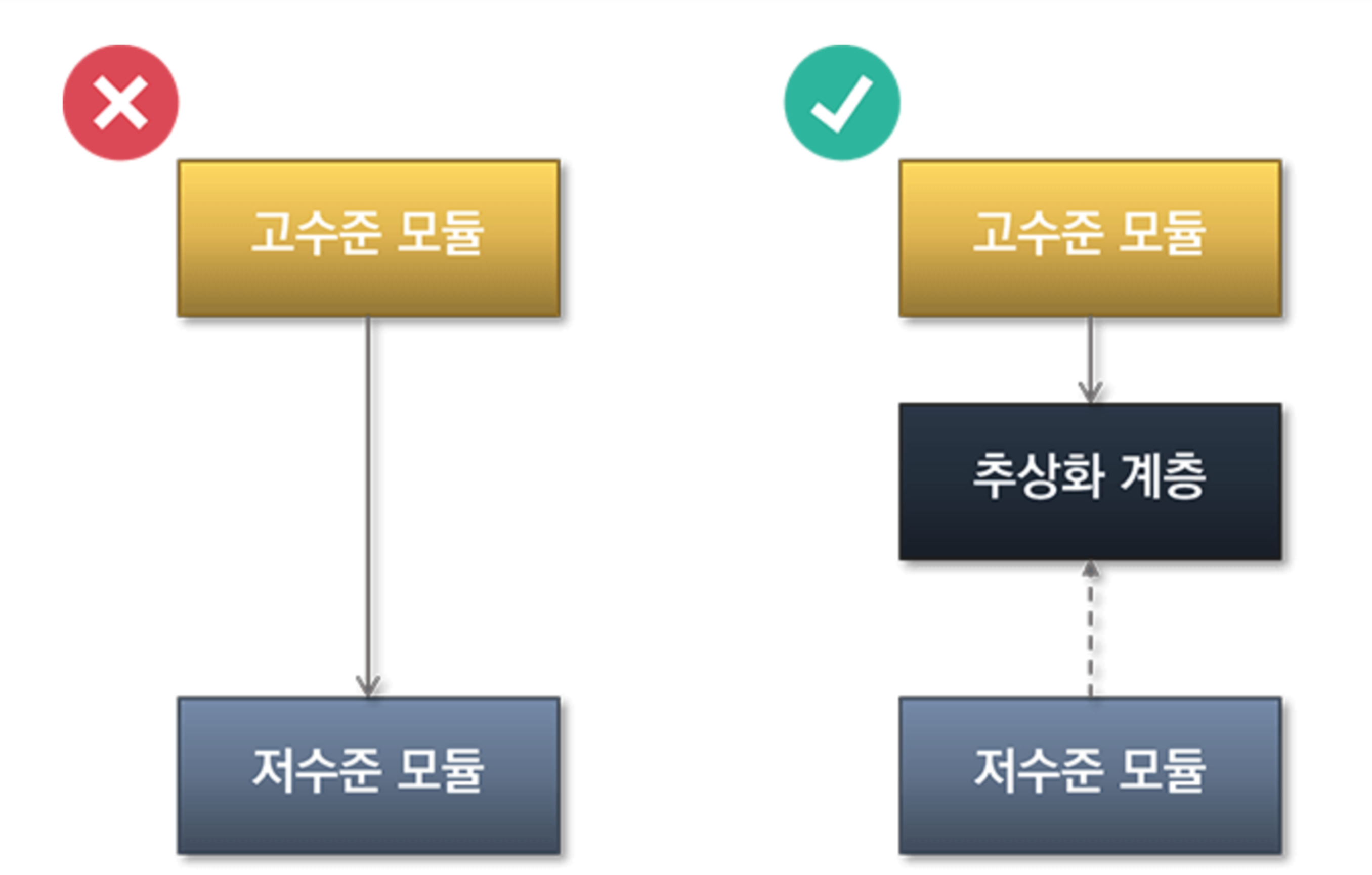 - 내부코드를 변경한다고 해서 외부(사용하는 측면) 에서 영향을 받아서는 안된다.