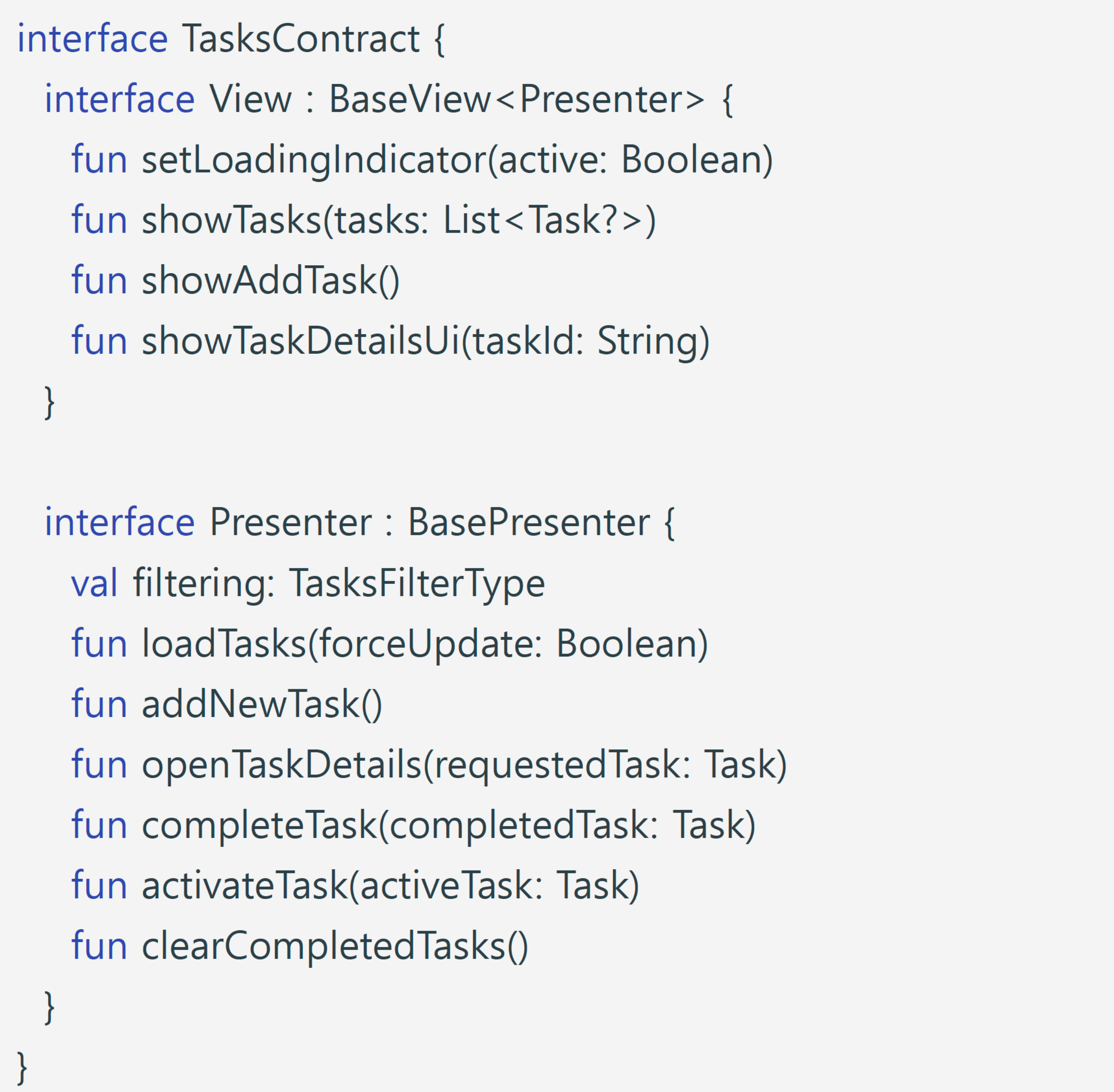 - Contract 에 정의한 인터페이스를 통해서 뷰와 프리젠터간의 직접적인 연결을 끊는다.