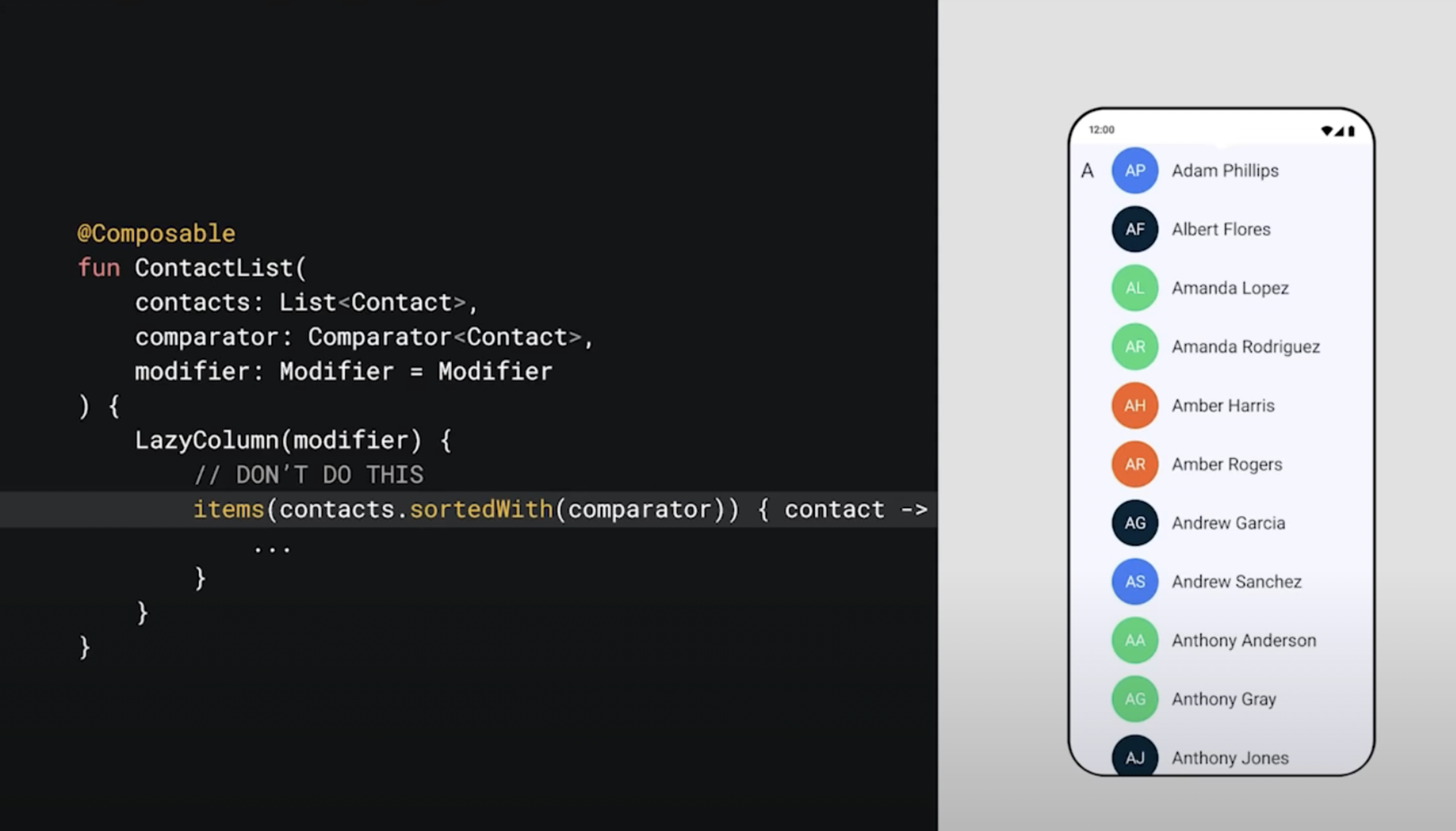 - 아래 경우 항상 재실행된다. 왜냐면 우리의 소팅이 스콥 내부에 있다. 이것은 매번 recomposition 될때마다 불리게 될것이다. 리멤버 함수를 이용해서 소팅로직을 분리하면 이런 이슈를 해결할 수 있다.