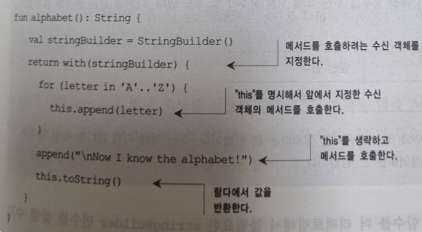 수신 객체를 명시하지 않고 람다의 본문 안에서 다른 객체의 메서드를 호출할 수 있게하는것