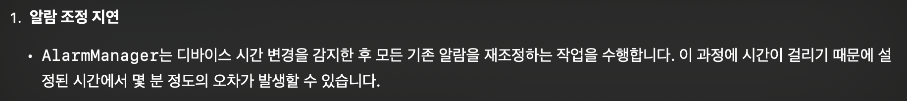 - Doze모드 등 특정 상황에 알람이 정확하게 울리지 않는다.