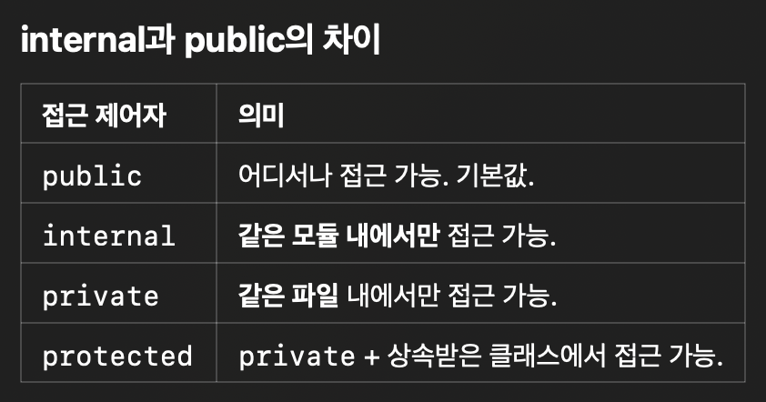 - 불필요하게 노출하면 코드 관리가 어려워질 수 있으므로, 내부적으로만 사용되도록 internal로 제한하는 것이 바람직합니다.