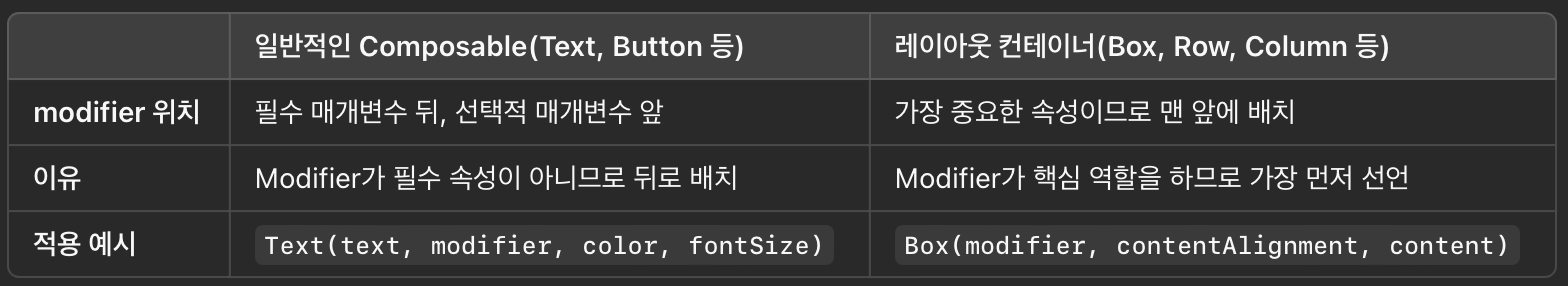 Box, Row, Column 같은 레이아웃 컨테이너에서는 modifier가 가장 중요한 속성이므로 맨 앞에 위치합니다.