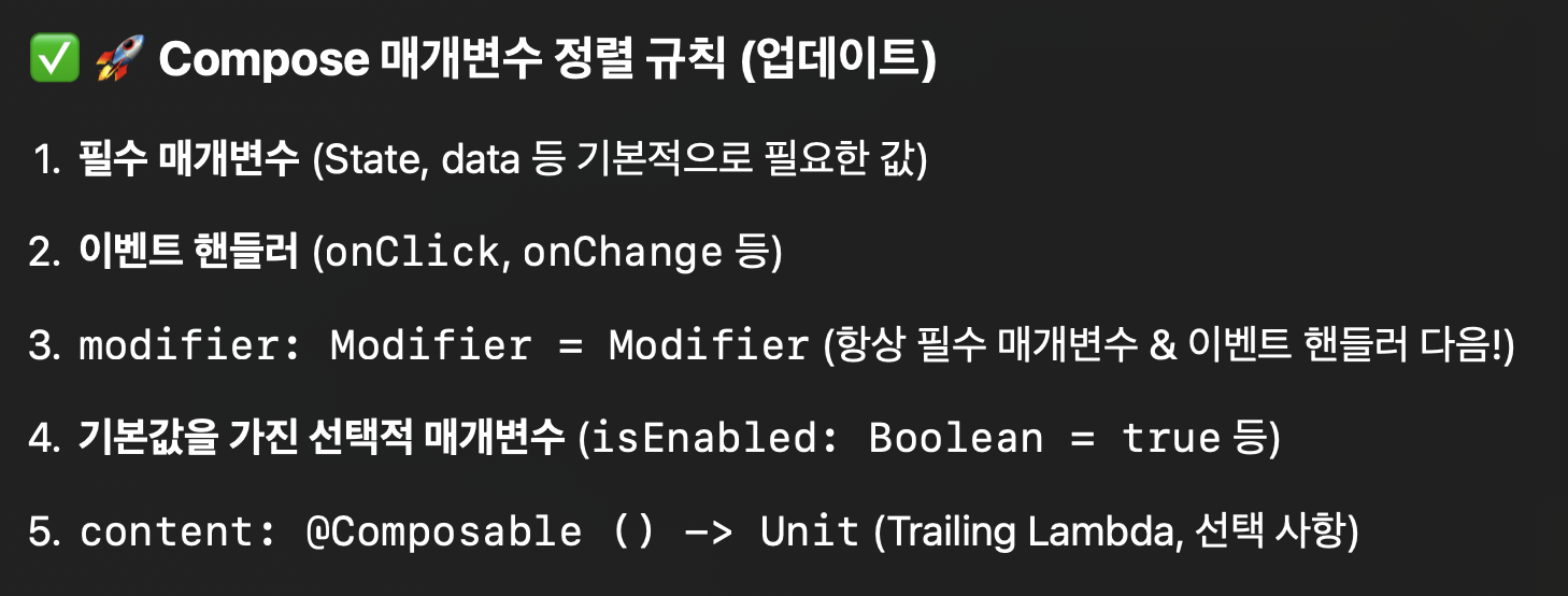 - modifier가 크기, 정렬, 배경 등 핵심 속성을 담당하므로 맨 앞에 위치하는 것이 일반적