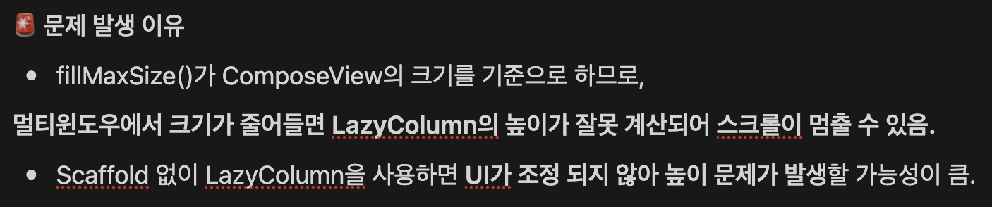 📌 멀티윈도우에서 Scaffold 없이 LazyColumn을 사용할 경우 발생하는 문제: