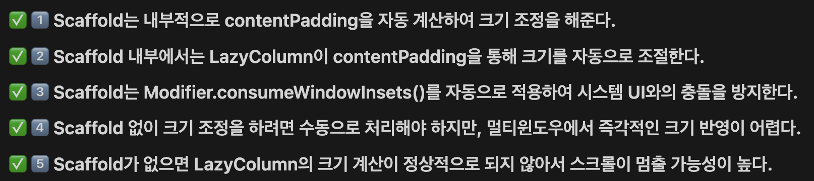 이 contentPadding이 없으면 LazyColumn이 topBar 및 bottomBar과 겹쳐서 UI가 깨질 가능성이 큽니다.
