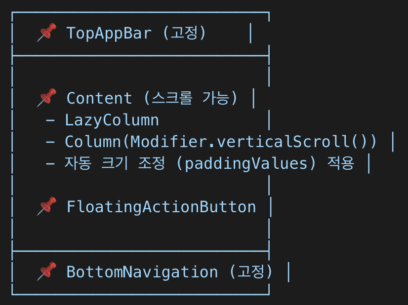 ✔ Scaffold는 contentPadding을 적용하여 LazyColumn이 topBar 및 bottomBar와 겹치지 않도록 자동 조정합니다.