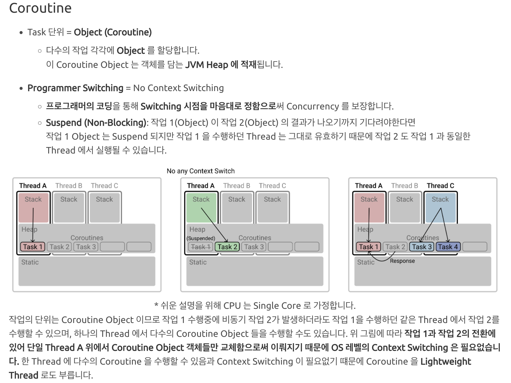 # Coroutine Android Developer 에서의 정의 “비동기적으로 실행되는 코드를 간소화 하기 위해 Android 에서 사용할 수 있는 동시 실행 설계 패턴” 코루틴은 Android의 비동기 프로그래밍에 권장되는 솔루션입니다. 주목할 만한 기능은 다음과 같습니다. 경량: 코루틴을 실행 중인 스레드를 차단하지 않는 *정지*를 지원하므로 단일 스레드에서 많은 코루틴을 실행할 수 있습니다. 정지는 많은 동시 작업을 지원하면서도 차단보다 메모리를 절약합니다. 메모리 누수 감소: *구조화된 동시 실행*을 사용하여 범위 내에서 작업을 실행합니다. 기본으로 제공되는 취소 지원: 실행 중인 코루틴 계층 구조를 통해 자동으로 취소가 전달됩니다. Jetpack 통합: 많은 Jetpack 라이브러리에 코루틴을..