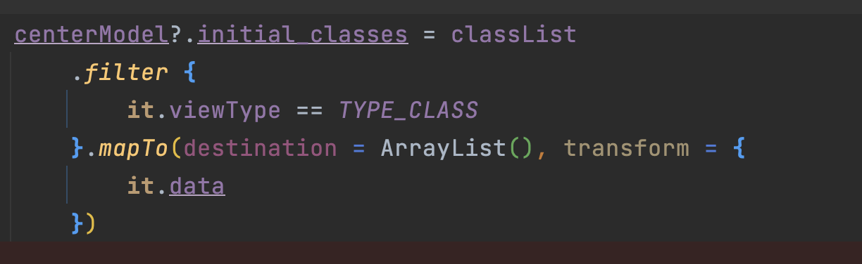 mapTo https://kotlinlang.org/api/latest/jvm/stdlib/kotlin.collections/map-to.html mapTo - Kotlin Programming Language kotlinlang.org inline fun Array.mapTo( destination: C, transform: (T) -> R ): C collection 프레임워크 사용시 각 element의 변형을 거쳐 다른 collection에 쉽게 복사할 수 있는 함수 나는 filter를 걸어서 원하는 타입의 뷰중에 데이터만 리스트로 뽑았다.(헤더에 data는 null이라서) 참조 : https://skytitan.tistory.com/180